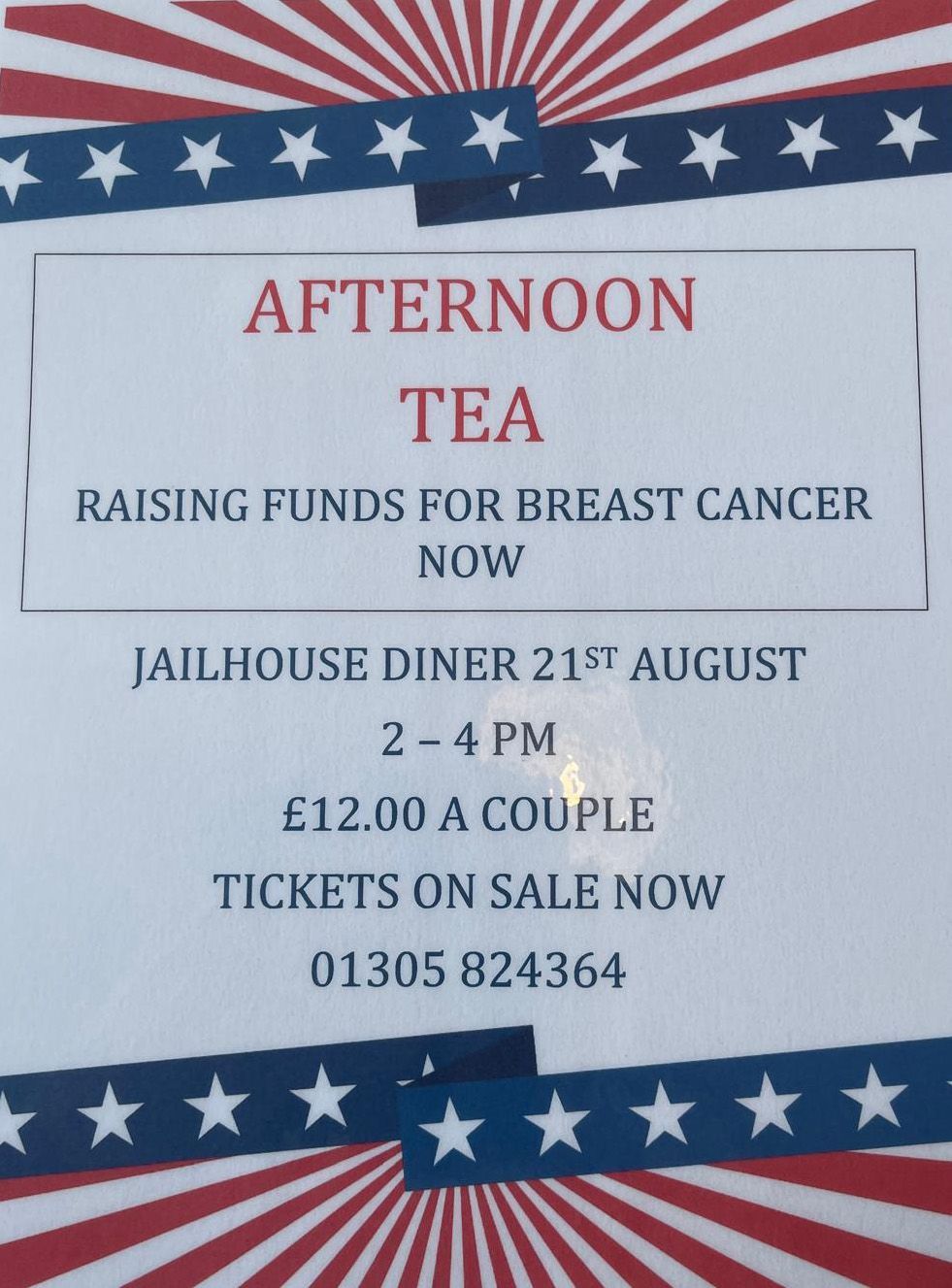 Charity fundraising event in aid of Breast cancer with an afternoon tea - Tickets on sale now £12.00 per couple.